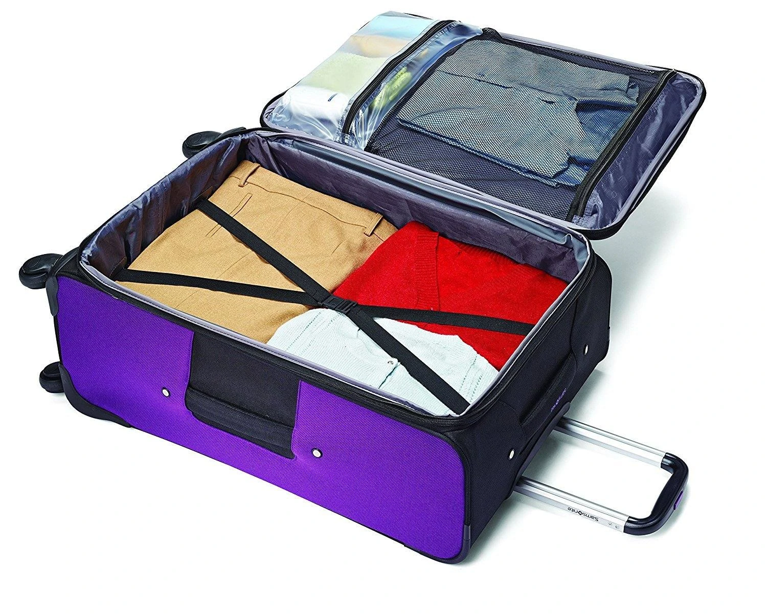 Pack clothing and other must haves for a few days out of town inside this stylish spinner bag from Samsonite. The Samsonite Aspire GR8 Spinner 25 bag is made from durable polyester fabric and features a lightweight and sturdy design with a retractable pull handle and four multi-directional spinner wheels that offer incredible mobility. This spinner has a large main compartment with a fully lined interior that includes criss-cross tie-down straps, a zippered mesh pocket underneath the lid, and a wetpak to hold toiletries or accessories. Exterior zipper pockets offer extra storage for small items or last minute add ons.